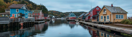 A serene harbor scene featuring fishing boats nestled against the dock, surrounded by colorful fishing gear, reflecting the essence of coastal life and maritime industry.