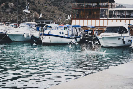Boats in seaside marina, Croatian town of Crikvenica, selective focus