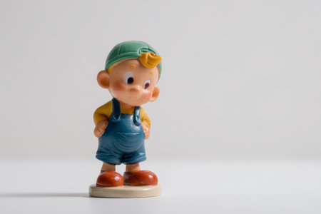 A child toy stands still on a plain background. This small figure symbolizes moments of childhood that are gone. The bright colors contrast the empty space around it.