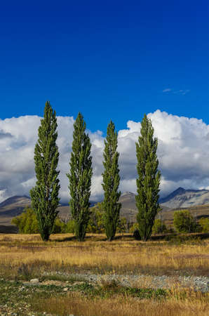 Poplars on a field near Lake Tekapo against blue sky with big white clouds. South Island, New Zealand