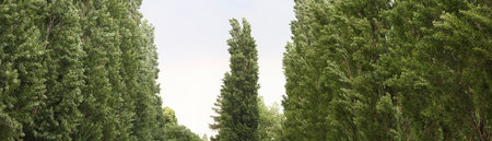 Tall Green Poplar Trees Against Clear Blue Sky with Copy Space