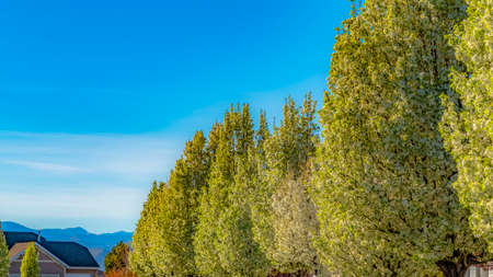 Panorama Lush trees with white flowers lining the side of a road in front of houses