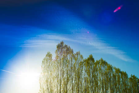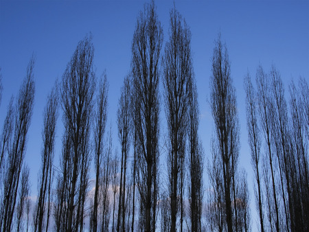 Low angle view of tall poplar trees in early spring with clear blue sky