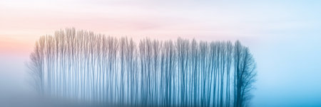 A serene grove tall features, slender trees standing in perfect alignment, bathed in the soft light of dawn. The delicate branches create a gentle silhouette against the pale sky, inviting calm reflection amidst nature's beauty.
