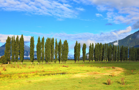 Along green fields avenues of cypresses grow. Rural areas in the Chilean Patagonia. Mountain range is visible in the distance
