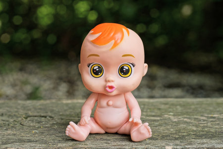 one small brown plastic toy doll sits on a gray table on a summer street