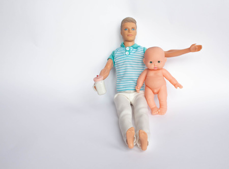 Father and son, dolls on a white background, father holds son in his arms, feeds his son. Caring for the family.