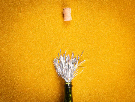 From above opened bottle with silver decoration simulating champagne and cork on golden background