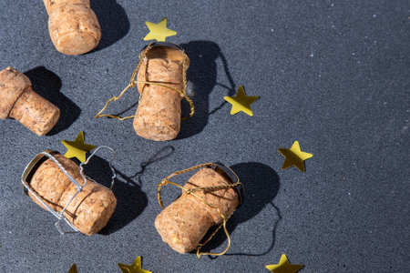 A few champagne or wine corks on a black background.A drink for the holiday. Background and texture.