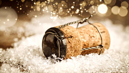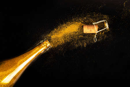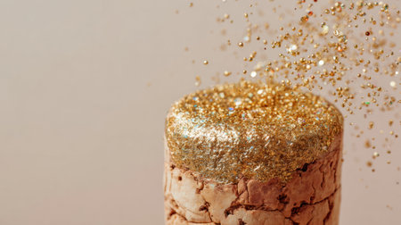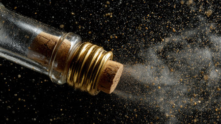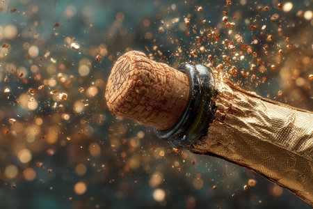 A cork from sparkling wine is popping off, sending golden particles into the air, creating a festive and elegant atmosphere of celebration.