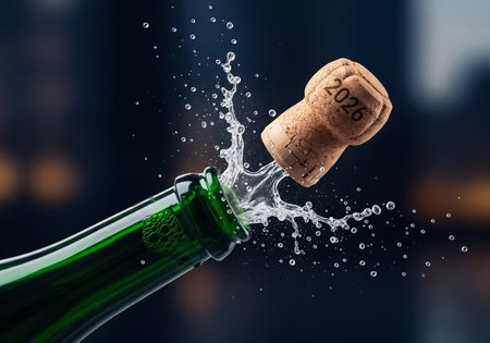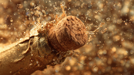 Champagne cork bursting out of the bottle, sending golden bubbles and a splash of sparkling wine into the air, creating an atmosphere filled with celebration and joy