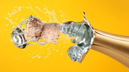 Close up of champagne bottle and cork splashing out of it