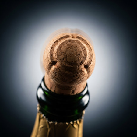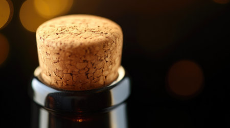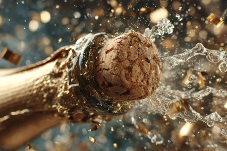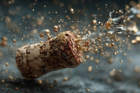 A cork from sparkling wine pops, sending golden particles into the air, symbolizing joy and celebration during a special event with elegance.