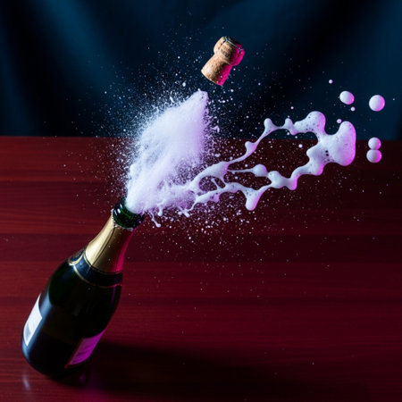 Cork is explosively released from a champagne bottle, creating a dynamic splash of liquid surrounded by sparkling droplets.