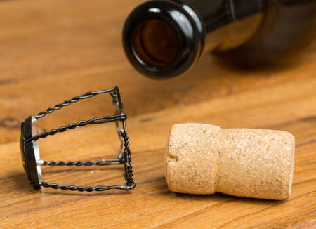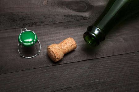 Champagne cork and bottle on wooden table with dark background.