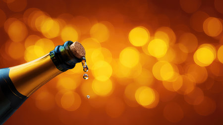 A close-up of a champagne bottle with an open cork, showcasing dripping bubbles against a warm, blurred golden background, ideal for festive occasions and celebrations.