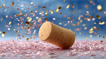 A vibrant and lively scene showcasing a cork flying in the air, surrounded by colorful confetti, perfect for celebrating special events and joyous moments.