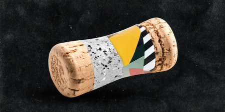 Collage cork bottle stopper with terrazzo and geometric pattern resting on black textured background expressing modern craft style