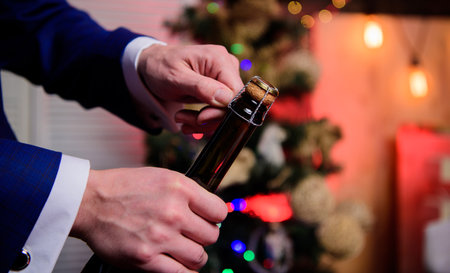 Lets celebrate. Open champagne and celebrate holiday. Celebrate new year with champagne drink. Toast and cheers concept. Male hands opening champagne bottle on christmas decorations background