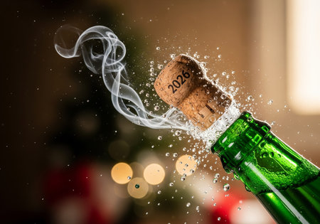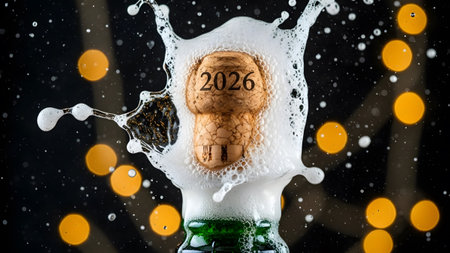 Champagne cork erupts with 2026 year, foam splash and bokeh lights Clear details and vibrant colo...