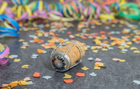 Champagne cork with carnival decoration on a slate