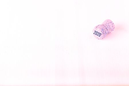 Champagne cork on white wooden background with date 2020. The concept of the New Year
