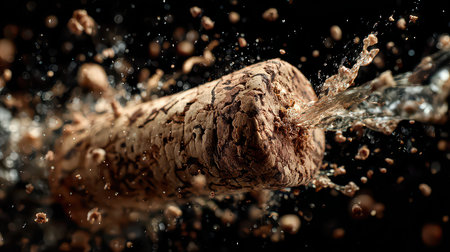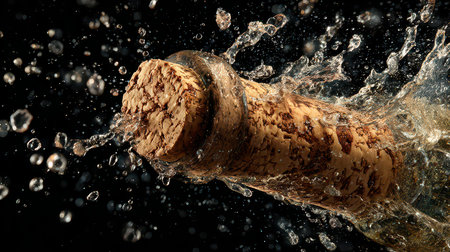 Dynamic image captures champagne cork bursting with water and splashes against a dark backdrop, symbolizing celebration and joy at festive occasions.