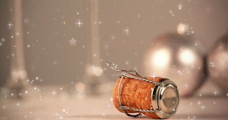 Twinkling stars against wooden cork with christmas ornament and champagne flute