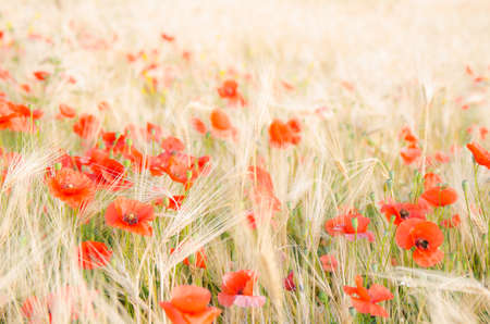 Field of wheat with poppies in the morning light. Shallow depth of field