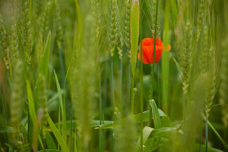 one big red poppy flower in the green wheat field in summer