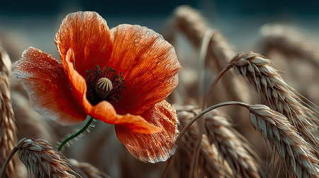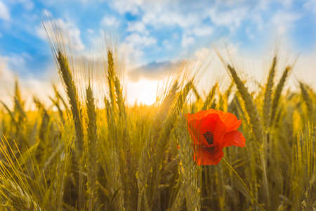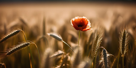 A single, radiant red poppy stands out amidst a field of golden wheat, bathed in the warm, golden light of a setting sun. The poppy's delicate petals contrast beautifully with the tall, swaying wheat stalks, creating a serene and picturesque scene. The soft, warm hues of the sunset add a sense of tranquility and peace to the landscape.