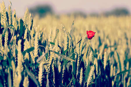 Single red poppy in the field of yellow ripe wheat