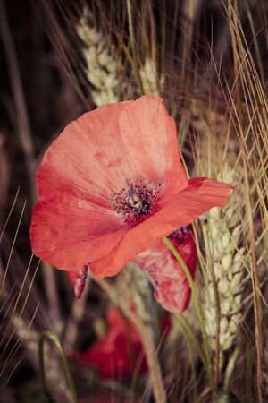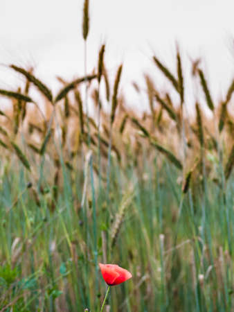 colorful wild poppy growing in wheat field ( Papaver rhoeas )