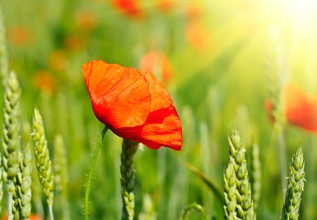 in a green corn field stands a bright poppy flower