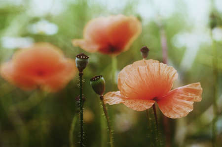 Poppy flowers in the meadow. Soft focus, shallow DOF.