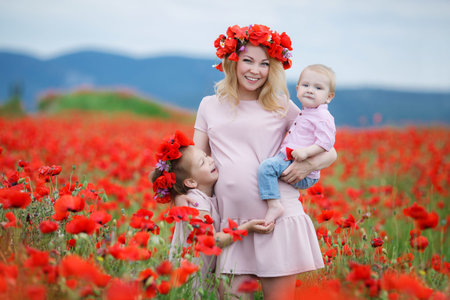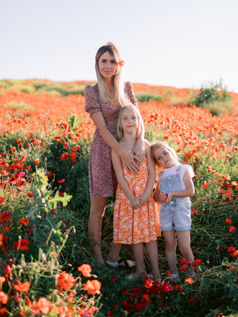 Mother with her daughters posing in a blooming poppy field. Beauty woman and kids in dress with red flowers
