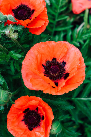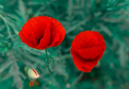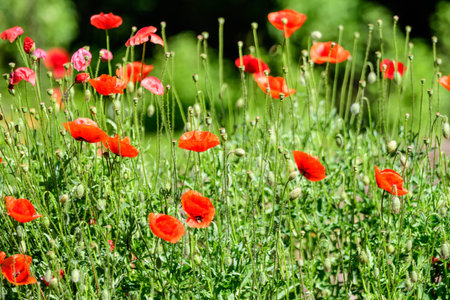 Beautiful red poppies and buds in the garden. Selective focus. Red flowers in the green grass. Countryside flowers