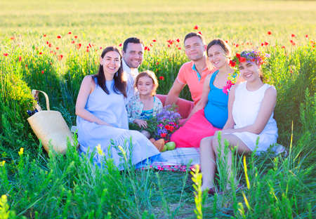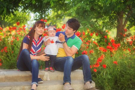 Happy family resting on the poppy field