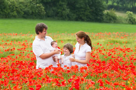 Happy young family with a son and a newborn daughter standing in a beautiful poppy flower field