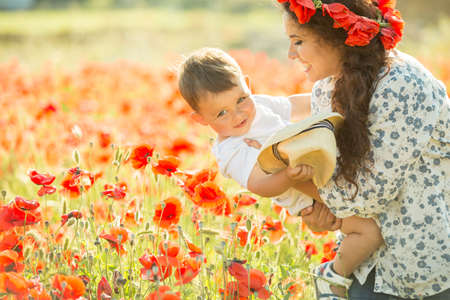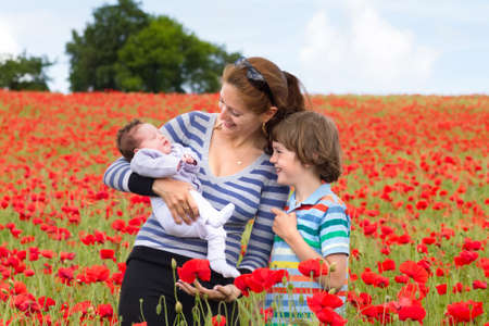 Young mother with her son and newborn baby in a beautiful red flower field