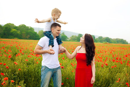 Beautiful young family walking on the poppy field in summer