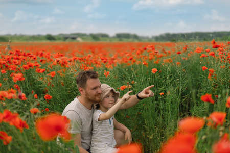 Happy fathers day. Little boy and father are playing in a beautiful field of red poppies.