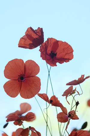 Close up beautiful red poppy flowers in sunset light in the park. Selective focus. Copy space