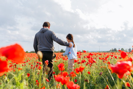 rear view of father and daughter walking away in the poppy field