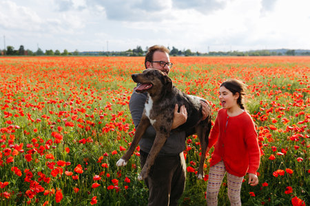portrait of happy father and daughter hugging their dog in the field of poppies