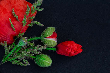 flower arrangement of red poppies on black background, copy space