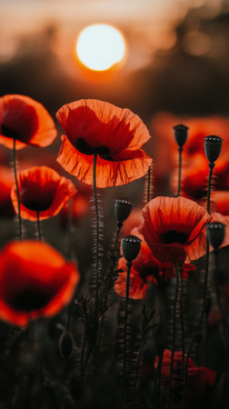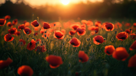 Vibrant red poppies in full bloom, basking in the warm glow of a setting sun, dominate a serene and picturesque field