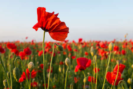 Field of red poppies in bright evening light