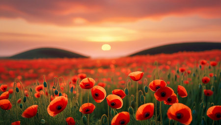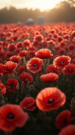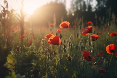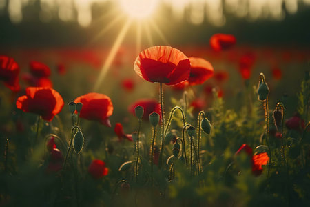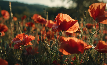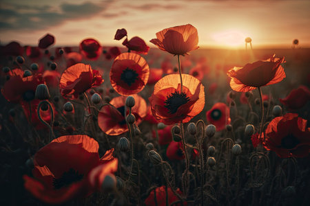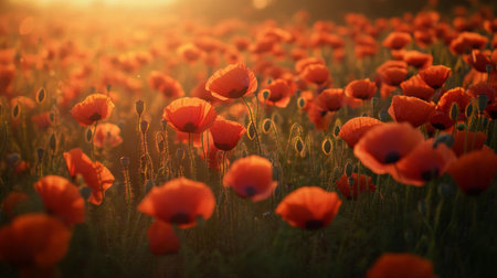 AI Generated. Field of bright red poppies bathed in warm sunset glow