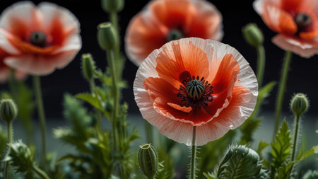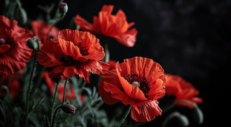 poppy flowers on a dark background, macro photo with shallow depth of field